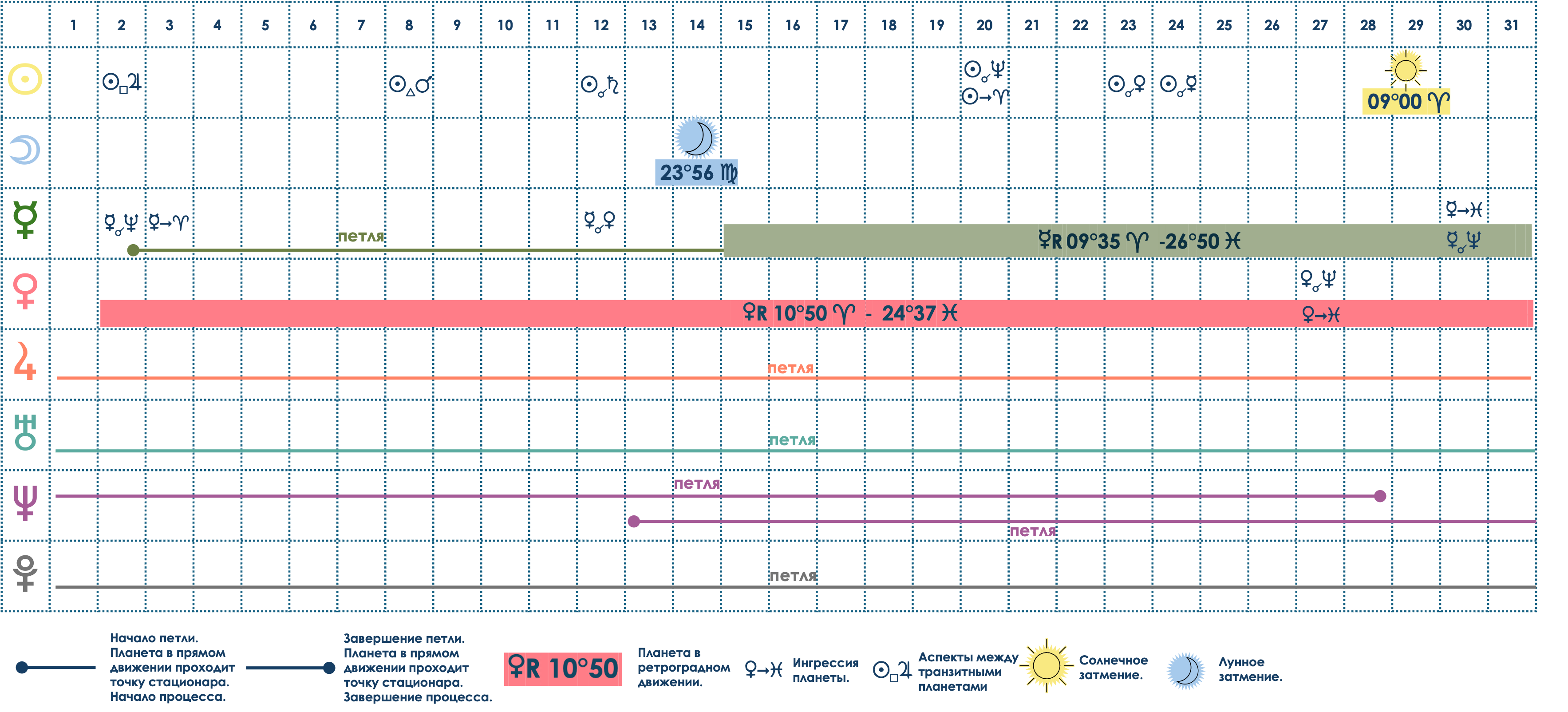 Со 2 марта 2025. В период ретроградной Венеры происходит переоценка всего, что приносит радость и удовольствие, возникает желание перемен. Люди склонны ориентироваться только на свои чувства и желания, выбирая то, что любили или пережили в прошлом. Обостряется эмоциональный фон, появляется чувства ревности и неудовлетворённости отношениями. Могут возникать конфликты и разногласия, особенно если проблемы в отношениях скрывались раньше. Могут возвращаться бывшие возлюбленные и возобновляться отношения. Если отношения стабильны, то пара открыто обсуждают свои разногласия, не сталкиваясь с серьёзными проблемами. Также данный период влияет и на внешний вид и финансы. Может появиться желания сменить имидж. Необходимо осторожно относиться ко всему, что связано с деньгами.
